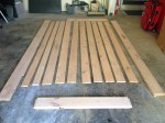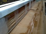 The metal track was encased in plastic but, surprisingly, the wood door kit was NOT. I didn’t want to contact their unpleasant customer service supervisor (who promised me a credit that I have still not received), so I left the wood stacked as packed and dragged it into the house to acclimate. I thought that if I left it stacked it might not warp so badly, and I was partially right. Two slats warped, but we were able to work with them, and sand off the mildew.