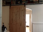 We called in a great handyman to install the metal track, and he muscled the door the rest of the way and made everything look easy! You can order the tracks with the holes pre-drilled — they distribute them according to the weight of the door, not necessarily 16″ apart, like studs. Fortunately, I was able to install in a spot that had solid wood behind the drywall, so I didn’t have to worry about finding studs. I was surprised, though, that they sent me 2 5’6″ track lengths, when I ordered an 11′ track; there’s a connector, but you have to be very careful about aligning them so the door slides smoothly. I also had them route out the back of the door where the door pull is inserted, which saved a lot of effort. Before painting…
