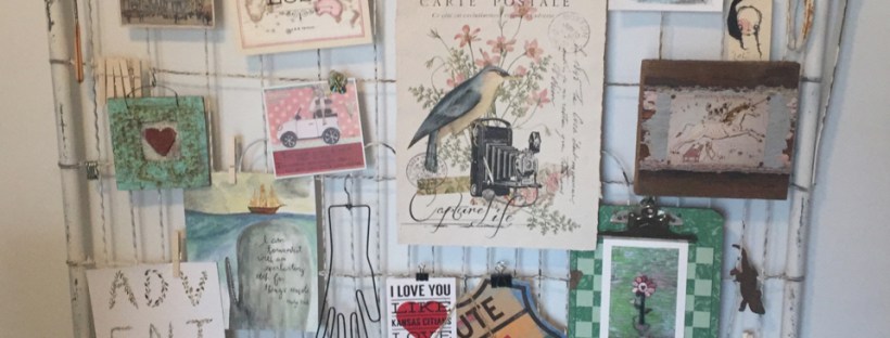 My Home-as-Scrapbook philosophy makes me constantly re-invent displays and vignettes around the house. I’ve been hauling this old gate around for years, but finally found a wall for it in my new home office.