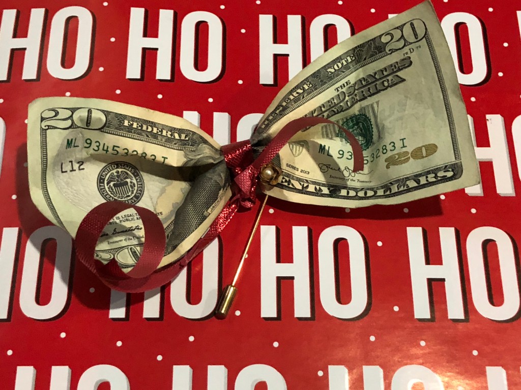 Look what my clever mom did last year. It was attached to a package, but it’s just as cool all alone. She even added an antique stick pin. But I just like turning a dollar bill into a decoration. Super simple!